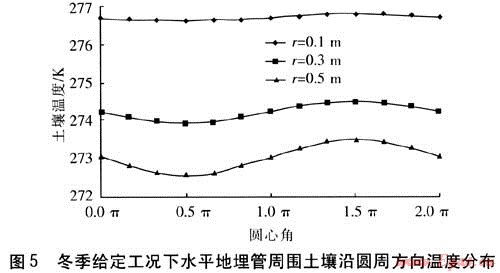 由圖5可知:①土壤溫度沿圓周方向呈正弦曲線分布,每個(gè)圓周上溫度最高點(diǎn)(曲線波峰)都是出現(xiàn)在原平面的1.5π方向,即圓周最底端;溫度最低點(diǎn)(曲線波谷)出現(xiàn)在原平面的0.5π方向,即圓周最頂端。②圓周方向上的土壤溫度呈正弦曲線分布,但每個(gè)圓周上的土壤平均溫度不同,即土壤溫度沿3條正弦曲線都在自己的中心線附近變化。這是由于隨著圓周遠(yuǎn)離地埋管,土壤溫度逐漸降低,r=0.1m圓周上的土壤平均溫度要高于r=0.3、0.5m圓周上的土壤平均溫度。③圓周方向上的土壤溫度呈正弦曲線分布,但每個(gè)圓周上的土壤溫度變化幅度各不相同,即溫度曲線的振幅不同。r=0.1m的曲線振幅最小,r=0.5m的曲線振幅最大,即距地埋管中心越近的圓周,其上土壤溫度變化程度越小;距地埋管中心越遠(yuǎn)的圓周,其上土壤溫度變化程度越大。這是由于地埋管上方的土壤隨著位置越遠(yuǎn)離地埋管越易受到大氣低溫的影響,因此地埋管上方的土壤隨著位置遠(yuǎn)離地埋管,溫度逐漸降低,而且這種降低的速度越來(lái)越快。而地埋管下方的土壤隨著位置越遠(yuǎn)離地埋管受大氣低溫的影響越小,這部分土壤由于遠(yuǎn)離地埋管溫度也逐漸降低。但由于深度加大受大氣低溫影響減小,這種降低的速度卻是越來(lái)越慢的。這就導(dǎo)致在距地埋管距離越遠(yuǎn)的圓周上,土壤溫度差距越大,即同一圓周上土壤的溫度變化越劇烈,變化的范圍越大。
