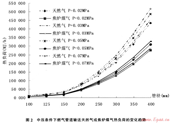 燃?xì)夤艿肋M(jìn)口壓力分別為0.02MPa、0.03MPa、0.05MPa和0.07MPa時(shí),在等壓降、等管徑以及相同管道長度的條件下,燃?xì)夤艿垒斔吞烊粴馀c焦?fàn)t煤氣的熱負(fù)荷見表5。變化趨勢見圖2。由表5可知,對于兩者而言,在相同條件下,燃?xì)夤艿垒斔吞烊粴庀鄬範(fàn)t煤氣熱負(fù)荷的增長率為57%~58%,即原有燃?xì)夤艿烙山範(fàn)t煤氣置換為天然氣后管道輸送能力增長率為57%~58%。由圖2可知。分別對于燃?xì)夤艿垒斔吞烊粴饣蚪範(fàn)t煤氣而言。管道入口壓力不變管徑增大時(shí)熱負(fù)荷均明顯增大,增長曲線較陡;管徑不變管道入口壓力升高時(shí)燃?xì)廨斔蜔嶝?fù)荷也增大,但增長較少。由此可見,管徑增大相比管道入口壓力升高更能影響燃?xì)廨斔拓?fù)荷的增長。