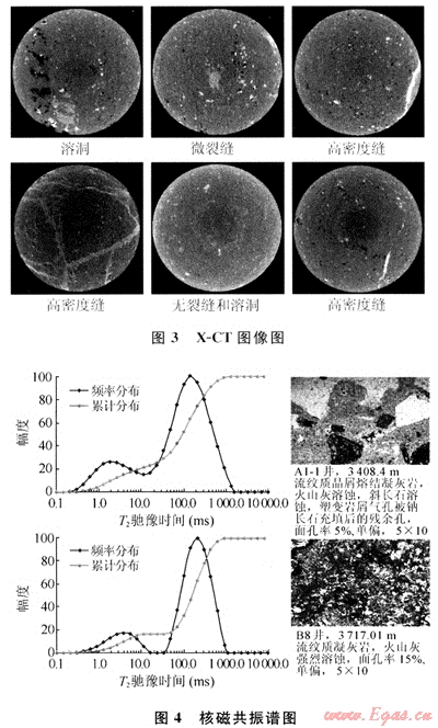 火山巖儲層孔洞發(fā)育較差,部分巖心內可見有裂縫,但裂縫有兩種明顯不同的產狀特征:①裂縫的寬度雖然較大,但裂縫內通常被高密度的物質充填;②裂縫的寬度雖然較小,但裂縫通常處于張開狀態(tài),裂縫內的充填物較疏松,孔、洞、縫之間的連通性較差(圖3)。