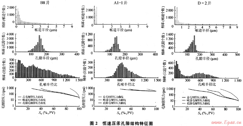 多數(shù)樣品孔隙半徑小于0.1μm,為微孔喉,占54.04%,大于0.5μm的為大孔喉僅為7.52%,0.1~0.5μm之間的為中小孔喉占38.44%,表明該區(qū)儲層孔隙半徑以微孔喉為主,孔隙結構有5種形式,儲層主要為Ⅰ、Ⅱ、Ⅲ類;火山巖儲層巖心排驅壓力平均為7.63MPa,其中排驅壓力較小聲d<1MPa的樣品占17.55%,pd在1~5MPa的樣品占47.35%,最大汞飽和度平均為68.14%,剩余汞飽和度平均49.34%,退出效率為36.22%,反映研究區(qū)連通性好的樣品比例較低,孔喉比較大,連通孔隙的平均孔喉少,孔隙大小的均一程度較差,表明巖心中孔隙與喉道的尺寸大小不均勻(圖1)[4]。