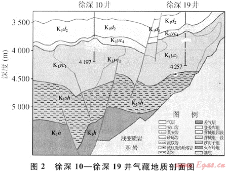實測資料顯示徐家圍子斷陷徐南地區(qū)目前發(fā)現(xiàn)有2口井存在超壓現(xiàn)象,分別為徐深19井和徐深10井,超壓層位為下白堊統(tǒng)營城組一段(表1)。通過研究這兩口井的氣藏地質(zhì)剖面來分析該地區(qū)超壓的形成原因(圖2)。
