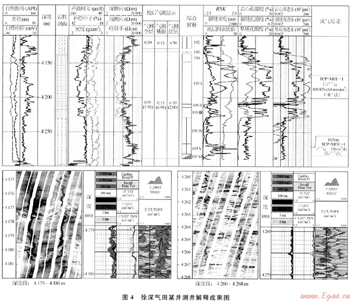 利用上述方法編制常規(guī)測(cè)井資料識(shí)別裂縫發(fā)育程度評(píng)價(jià)程序和裂縫參數(shù)計(jì)算程序,并對(duì)研究區(qū)若干井進(jìn)行了計(jì)算,圖4是其中一口井的處理解釋結(jié)果:195Ⅰ層TCP+MFE-Ⅰ測(cè)試,日產(chǎn)氣105876m3,該層地層因數(shù)比值為15.6,裂縫角度指示參數(shù)為1.9,顯示該層高角度裂縫較發(fā)育,裂縫張開度1150.5μm,裂縫孔隙度0.11%,裂縫滲透率310.9×10-3μm2,F(xiàn)MI圖像顯示195Ⅰ層垂直縫和高角度縫發(fā)育,核磁測(cè)井T2分布譜顯示為30ms以上的大孔隙,表明本層裂縫提供了極好的流體滲流通道,使得儲(chǔ)層在自然測(cè)試時(shí)能達(dá)到高產(chǎn)。下部195Ⅴ、195Ⅵ兩層地層因數(shù)比值29.9,裂縫角度指示參數(shù)0.5,顯示該段地層發(fā)育40°~70°的傾斜裂縫,測(cè)井計(jì)算的裂縫張開度為9.8μm,裂縫孔隙度0.02%,裂縫滲透率0.002×10-3μm2,表明該段地層裂縫雖然發(fā)育,但為無效縫或裂縫的徑向延伸較淺,沒有起到溝通流體滲流通道的作用,對(duì)產(chǎn)能沒有貢獻(xiàn)。FMI圖像顯示195Ⅴ、195Ⅵ兩層存在誘導(dǎo)縫特征,徑向延伸短,裂縫開度小,是無效縫。核磁測(cè)井T2分布譜顯示小于30ms的束縛水孔隙,地層裂縫被低阻泥質(zhì)充填。該段地層經(jīng)TCP+MFE-Ⅰ測(cè)試,日產(chǎn)氣106m3。