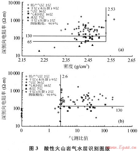 在儲層“四性”關(guān)系研究的基礎(chǔ)上,通過敏感性分析,確定了最能反映儲層流體性質(zhì)特征的參數(shù)電阻率、密度和氣測比值,建立了酸性火山巖氣水層解釋圖版(圖3),圖版精度都超過90.0%,達到了儲量規(guī)范的要求。