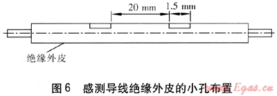 感測導(dǎo)線的絕緣外皮有規(guī)則的孔(見圖6),小孔可以感知保溫層濕度的變化??椎拈g隔為20mm,每個小孔的寬度為1.5mm。漏點檢測系統(tǒng)要求感測導(dǎo)線、反饋導(dǎo)線與管道之間的阻抗以及兩導(dǎo)線之間的絕緣電阻必須大于等于50MΩ。