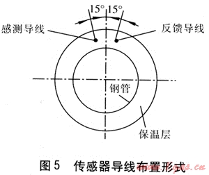 使用鎳鉻合金線作為傳感器導(dǎo)線,分為感測導(dǎo)線、反饋導(dǎo)線,兩根導(dǎo)線總稱為傳感器導(dǎo)線。供熱管道制造過程中,在每段管道中安裝兩根導(dǎo)線,傳感器導(dǎo)線布置形式見圖5。