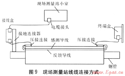 現(xiàn)場測量站線纜連接方式見圖9。主要連接裝置有:現(xiàn)場測量站小室內(nèi)安裝漏點檢測模塊、通信模塊等;現(xiàn)場測量站小室與接線盒之間的連接電纜;帶有接地連接器的接線盒;用于連接感測導(dǎo)線與反饋導(dǎo)線的終端盒等。現(xiàn)場測量小室、接線盒、終端盒、連接電纜的防護等級均為IP65。
