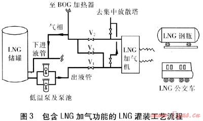如果LNG氣化站周邊區(qū)域存在LNG汽車生產(chǎn)廠商(LNG汽車出廠發(fā)貨前需加注LNG)或者與公交公司達(dá)成LNG汽車推廣合作意向后,便可利用LNG氣化站的現(xiàn)有設(shè)施延伸增加LNG汽車加氣功能,即通過(guò)改進(jìn)原有LNG灌裝工藝,將LNG鋼瓶灌裝與LNG汽車加氣兩大流程組合集成,從而形成一套系統(tǒng)、兩種功能的LNG灌裝系統(tǒng)。