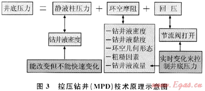 MPD主要是通過對回壓、流體密度、流體流變性、環(huán)空液位、水力摩阻和井眼幾何形態(tài)的綜合精確控制,使整個井筒的壓力精確的維持在地層孔隙壓力和破裂壓力之間,進行平衡或近平衡鉆井,如圖3所示。