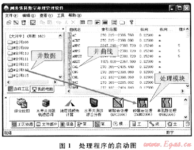 處理程序在設(shè)計(jì)時(shí),應(yīng)用了Windows系統(tǒng)的拖放功能實(shí)現(xiàn)對(duì)數(shù)據(jù)的調(diào)度,只要將井?dāng)?shù)據(jù)拖到相應(yīng)處理模塊圖標(biāo)上,則可應(yīng)用該模塊進(jìn)行處理(圖1)。