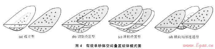 密井網(wǎng)解剖表明,蘇里格氣田盒8段儲(chǔ)層有效單砂體空間分部類型有4種(圖4):