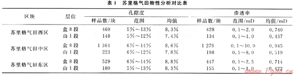 蘇里格氣田主力層二疊系盒8段、山1段儲(chǔ)層形成于沖積背景下的河流沉積體系,河道內(nèi)部結(jié)構(gòu)復(fù)雜,隔夾層發(fā)育,非均質(zhì)很強(qiáng)。對(duì)氣田范圍內(nèi)93口取心井氣層段巖心分析進(jìn)行統(tǒng)計(jì),結(jié)果表明:孔隙度主要范圍在5%~12%之間,平均值為8.69%;滲透率主要范同為0.1~2mD,平均為0.733mD。各區(qū)塊之間存在一定差異,中區(qū)總體上好于西區(qū)和東區(qū)(表1)。