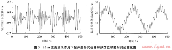 圖3是在10m波高波浪作用下鉆井船升沉位移和縱蕩位移隨時間的變化??紤]鉆井船的平均偏移為14m,假設(shè)慢漂運(yùn)動的單邊幅值為10m,慢漂運(yùn)動的周期為200s,波浪的有效波高為10m。