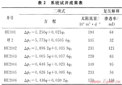 應(yīng)用壓力恢復(fù)、壓降、系統(tǒng)試井和一點(diǎn)法等多種試井方法研究?jī)?chǔ)層物性及產(chǎn)能特點(diǎn)。確定了各氣井較為真實(shí)可靠的產(chǎn)能方程(表2),為新井配產(chǎn)提供了依據(jù);同時(shí),運(yùn)用三維建模和數(shù)值模擬技術(shù),確定了合理井距為1400m,為實(shí)現(xiàn)稀井高產(chǎn)創(chuàng)造了條件。