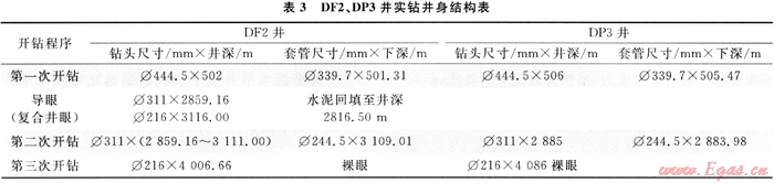 DF2、DP3井采用第三次開鉆井身結(jié)構(gòu),Φ339.7mm表套進入中下侏羅統(tǒng)直羅組,封住上部膠結(jié)強度低、疏松、易垮塌地層,第二次開鉆采用Φ311mm鉆頭,下入Φ244.5mm技術(shù)套管封住造斜段。第三次開鉆采用Φ215.6mm鉆頭,為下步完井方式的選擇留有余地,如果獲得理想的自然產(chǎn)能則裸眼完井,若自然產(chǎn)能低先進行氣舉、解堵,解堵后仍不能達到配產(chǎn)要求,可以下5½″尾管射孔完井,對儲層實施壓裂改造[5]。這樣既降低了施工風(fēng)險,又避免了小井眼中實施壓裂改造在工具上的局限性。鉆井實踐結(jié)果表明,這種井身結(jié)構(gòu)是合理的,其結(jié)構(gòu)簡單、施工方便,具有可操作性和經(jīng)濟性。DF2、DP3井實鉆井身結(jié)構(gòu)如表3所示。