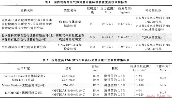我國尚未建立高壓氣體流量計量國家標準,迫切需要建立作為科研服務和量值傳遞標準的高壓氣體流量計量標準裝置,并在此基礎上建立CNG加氣機及高壓氣體流量計量檢測中心,以滿足我國對高壓氣體流量計量檢定的需要,也為國際天然氣貿易結算的公平、公正計量提供有力的檢測手段[3~6]。表2給出了國外主要CNG加氣機用高壓氣體質量流量計的生產廠家及產品技術指標。
