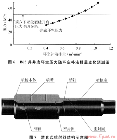 如圖6所示,在設(shè)計(jì)865井須六上亞段水力噴射壓裂時,當(dāng)環(huán)空補(bǔ)液排量達(dá)到0.7m3/min,井底環(huán)空壓力就超過已經(jīng)壓裂的須六下亞段的裂縫開啟壓力,因此須六上亞段的環(huán)空補(bǔ)液排量的上限就是0.7m3/min。