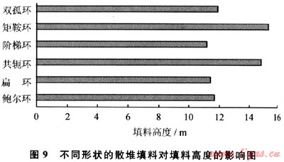 由于海上油田伴生氣中C02含量隨著石油產(chǎn)量的降低會(huì)相應(yīng)增加,為了提高裝置的適應(yīng)性,因此在設(shè)計(jì)時(shí)必須預(yù)留一定的富裕度。表1中顯示的C02體積分?jǐn)?shù)為5.54%,是中海石油集團(tuán)對(duì)海上油田伴生氣組分多年統(tǒng)計(jì)得到的最高值,以此作為設(shè)計(jì)標(biāo)準(zhǔn),能夠保證凈化系統(tǒng)具有很強(qiáng)的適應(yīng)性。由于MDEA胺液吸收C02是一個(gè)氣液界面?zhèn)髻|(zhì)并伴有化學(xué)反應(yīng)的過(guò)程,提高傳質(zhì)效率能夠有效降低填料高度。采用高效的填料是一種有效的提高傳質(zhì)效率、降低塔器設(shè)備高度的有效方法。圖9給出了不同形狀的金屬散堆填料對(duì)填料高度的影響。從圖9可知,矩鞍環(huán)對(duì)應(yīng)的填料高度最大,而階梯環(huán)對(duì)應(yīng)的填料高度最小,這是因?yàn)殡A梯環(huán)的比表面積最大,而矩鞍環(huán)的比表面積最小,如矩鞍環(huán)的比表面積為112m2/m3,而階梯環(huán)的比表面積為153m2/m3。因此,本項(xiàng)目中吸收塔、再生塔皆采用階梯環(huán)的散堆填料塔。