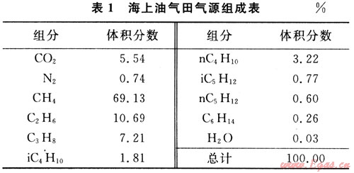 本文研究的海上橇裝天然氣液化裝置是針對(duì)渤海遼東灣海域某一油田伴生氣氣源而設(shè)計(jì)的,其氣源條件如表1所示。由表1可知,甲烷體積分?jǐn)?shù)僅為69.13%,而二氧化碳體積分?jǐn)?shù)為5.54%,C2+重?zé)N的體積分?jǐn)?shù)約為25%,因此,海上橇裝天然氣液化裝置采用MDEA+MEA混合醇胺溶液脫除氣源中C02酸性氣體,凈化后天然氣中C02體積含量小于58.5mg/m3。