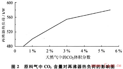 對(duì)于一定的處理量而言,原料氣中的C02含量直接決定吸收塔的大小,同時(shí)影響再生塔塔底再沸器熱負(fù)荷,從而影響運(yùn)行成本。圖2給出了天然氣中C02含量對(duì)再生塔底部再沸器熱負(fù)荷的影響。對(duì)于處理量為11.6×104m3/d的天然氣凈化系統(tǒng),保持胺液循環(huán)量500kmol/h不變,當(dāng)原料氣中C02體積分?jǐn)?shù)由1%增大到3%時(shí),再生塔熱負(fù)荷由500kW增加到550kW,增幅為10%。當(dāng)C02體積分?jǐn)?shù)為5.54%時(shí),再沸器熱負(fù)荷為580kW。