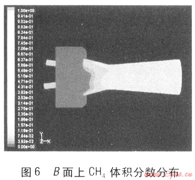圖6為引射器B面上CH4的體積分?jǐn)?shù)分布。在噴嘴內(nèi)CH4體積分?jǐn)?shù)為100%。在吸氣收縮管內(nèi),CH4體積分?jǐn)?shù)逐步增加,并引射一部分空氣進(jìn)入引射管。經(jīng)過(guò)喉部后,在擴(kuò)壓管部分,CH4與空氣混合均勻,體積分?jǐn)?shù)趨于穩(wěn)定。