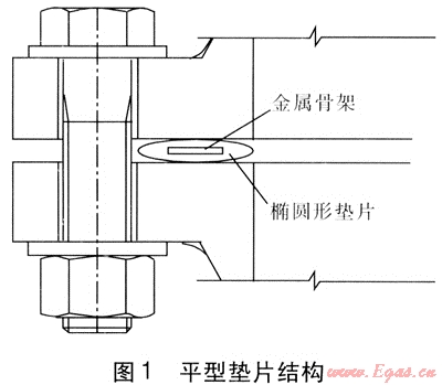 第1種結(jié)構(gòu)為平型墊片,其斷面幾何形狀為橢圓形,見圖1。當(dāng)用于天然氣管道時(shí),平型墊片表面非金屬部分可以采用丁腈橡膠等橡膠材料,并且在其中嵌裝環(huán)形金屬骨架。金屬骨架的橫截面為長方形,嵌裝在橢圓形橡膠墊片的中心部位。推薦在0.4MPa設(shè)計(jì)壓力下使用這種結(jié)構(gòu)形式的墊片。