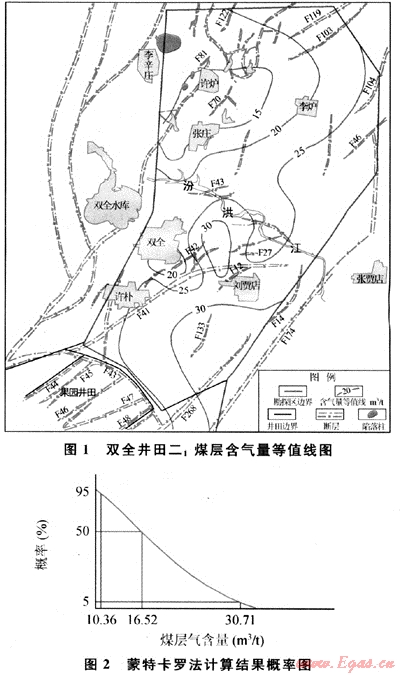 1) 安陽(yáng)礦區(qū)雙全井田煤層氣含量高,由蒙特卡羅法計(jì)算獲得的概率為50%時(shí)煤層氣含量為16.52m3/t。以此計(jì)算獲得的地質(zhì)資源量為35×108m3,可采資源量為19×108m3,可采資源豐度為0.89×108m3/km2。