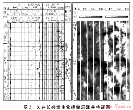 根據(jù)成像測(cè)井解釋結(jié)果,X井長(zhǎng)興組生物礁儲(chǔ)層特點(diǎn)是孔洞的大小和分布具有更強(qiáng)的非均值性,洞徑比飛仙關(guān)組儲(chǔ)層大;裂縫相對(duì)飛仙關(guān)儲(chǔ)層發(fā)育,成像測(cè)井處理有效裂縫密度為2.47條/m,沿裂縫具有較強(qiáng)的溶蝕作用,對(duì)產(chǎn)能的貢獻(xiàn)大;儲(chǔ)層孔隙度較飛仙關(guān)組的低,平均孔隙度4.78%。儲(chǔ)層類型為裂縫-孔隙型。生物礁儲(chǔ)層巖性為白云巖和灰質(zhì)云巖或白云質(zhì)灰?guī)r。儲(chǔ)層的測(cè)井特征為低自然伽馬、中低電阻率和低密度,高聲波時(shí)差和較高補(bǔ)償中子孔隙度,井徑有輕度縮徑現(xiàn)象(圖3)。