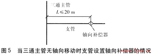 當(dāng)在支管上無(wú)法實(shí)現(xiàn)自然補(bǔ)償時(shí),可以考慮在支管上設(shè)置軸向補(bǔ)償器,軸向補(bǔ)償器的類型可根據(jù)供回水溫度、支管的管徑及其他技術(shù)要求選用。當(dāng)三通主管無(wú)軸向移動(dòng)時(shí),支管設(shè)置軸向補(bǔ)償器的情況見(jiàn)圖5。為了降低支管的軸向移動(dòng)對(duì)三通的推力,軸向補(bǔ)償器距三通的距離L應(yīng)滿足L≤20m[7]。