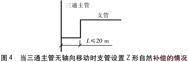 ② 當(dāng)三通主管允許有軸向位移時(shí),三通主管的軸向位移將使支管產(chǎn)生側(cè)向位移,此時(shí)應(yīng)控制三通到主管補(bǔ)償裝置的距離,保證三通處主管的最大軸向位移不大于50mm。三通處主管的最大軸向位移smax的計(jì)算式為: