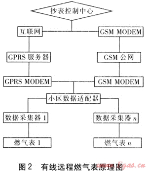 通過(guò)數(shù)字直讀式遠(yuǎn)程自動(dòng)抄表系統(tǒng),將無(wú)線數(shù)字通信技術(shù)、傳感器技術(shù)、單片機(jī)技術(shù)及大型數(shù)據(jù)庫(kù)管理系統(tǒng)有機(jī)結(jié)合在一起。抄表控制中心可以通過(guò)互聯(lián)網(wǎng)將數(shù)據(jù)傳輸至GPRS服務(wù)器,發(fā)送無(wú)線信息經(jīng)GPRS MODEM(無(wú)線調(diào)制調(diào)解器)接收處理后傳送給小區(qū)數(shù)據(jù)適配器,或者可以通過(guò)GSM MODEM(GSM調(diào)制解調(diào)器)將數(shù)據(jù)轉(zhuǎn)換為無(wú)線信息發(fā)送到GSM公網(wǎng),經(jīng)小區(qū)GSM MODEM接收處理后傳送給小區(qū)數(shù)據(jù)適配器,小區(qū)數(shù)據(jù)適配器再命令數(shù)據(jù)采集器將采集到的燃?xì)獗碜x數(shù)按原路回傳到抄表控制中心。具體原理見(jiàn)圖2。