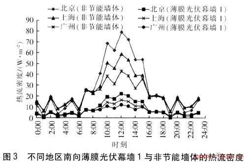 以北京、上海、廣州為例,北京θo,av,取28.6℃,θo,dr,取33.2℃;上海θo,av取30.4℃,θo,av取34℃;廣州θo,av取30.1℃,θo,dr取33.5℃。經(jīng)計算可得,不同地區(qū)南向薄膜光伏幕墻1與非節(jié)能墻體的熱流密度見圖3。由圖3可知,這3個地區(qū)墻體熱流密度最高值均出現(xiàn)在12:00左右。經(jīng)計算可得,對于這3個地區(qū),非節(jié)能墻體結(jié)合薄膜光伏組件后的節(jié)能率可達(dá)72%。