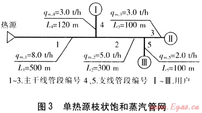 某單熱源枝狀飽和蒸汽管網(wǎng)(見(jiàn)圖3),管段1~5局部阻力當(dāng)量長(zhǎng)度分別為:管段1:1個(gè)截止閥、7個(gè)方形補(bǔ)償器,局部阻力當(dāng)量長(zhǎng)度為166.8m;管段2:1個(gè)直流三通、5個(gè)方形補(bǔ)償器、1個(gè)異徑接頭,局部阻力當(dāng)量長(zhǎng)度為84.8m;管段3:1個(gè)直流三通、2個(gè)方形補(bǔ)償器、1個(gè)異徑接頭、1個(gè)截止閥,局部阻力當(dāng)量長(zhǎng)度為46.3m;管段4:1個(gè)截止閥、1個(gè)分流三通、2個(gè)方形補(bǔ)償器,局部阻力當(dāng)量長(zhǎng)度為37.6m;管段5:管件、閥門(mén)設(shè)置與管段4相同,局部阻力當(dāng)量長(zhǎng)度為37.6m。熱源、用戶(hù)Ⅰ~Ⅲ的壓力分別為1.0、0.7、0.7、0.7MPa。