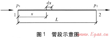 取長(zhǎng)度為L(zhǎng)的蒸汽管段為研究對(duì)象(見(jiàn)圖1),設(shè)管段起始節(jié)點(diǎn)為1,對(duì)應(yīng)壓力為p1;末端節(jié)點(diǎn)為2,對(duì)應(yīng)壓力為p2。