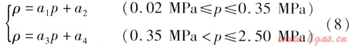 對(duì)于飽和蒸汽的熱力性質(zhì),國(guó)際水和蒸汽性質(zhì)協(xié)會(huì)(IAPWS)在1997年建議開(kāi)始使用新的水和蒸汽熱力性質(zhì)的IAPWS工業(yè)公式(簡(jiǎn)稱(chēng)為IAPWSIF97)[3],該公式是為了滿(mǎn)足動(dòng)力工業(yè)的需要而制定的,參數(shù)適用范圍大,表達(dá)式復(fù)雜。而常用供熱系統(tǒng)所用蒸汽壓力比動(dòng)力系統(tǒng)低得多,范圍也小得多,因此在供熱系統(tǒng)常用壓力范圍內(nèi)對(duì)狀態(tài)參數(shù)進(jìn)行擬合??紤]到工程應(yīng)用中以采用相對(duì)壓力為主,這里對(duì)相對(duì)壓力范圍0.02~2.50MPa的飽和蒸汽進(jìn)行擬合,得到密度與相對(duì)壓力的關(guān)系式: