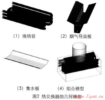 熱交換器的幾何模型如圖2。利用Gambit創(chuàng)建三維物理模型并劃分網(wǎng)格。排煙管的對稱結(jié)構(gòu)相對簡單,其中的氣流變化較緩慢,網(wǎng)格參數(shù)的間距尺寸取為0.005mm;其余部分的網(wǎng)格參數(shù)的間距尺寸城小為0.002mm??偣布s劃分7917萬個網(wǎng)格。