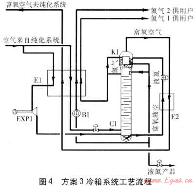 在C1底部產(chǎn)生的富氧液空經(jīng)E2過冷,節(jié)流后進入C2進行二次精餾,得到產(chǎn)品氮氣經(jīng)E2、E1復(fù)熱后作為氮氣1供用戶。得到富氧空氣經(jīng)E2復(fù)熱,進入E1被復(fù)熱到約-145℃后,送入EXP1膨脹制冷后,返回E1被復(fù)熱后,送入純化系統(tǒng)。