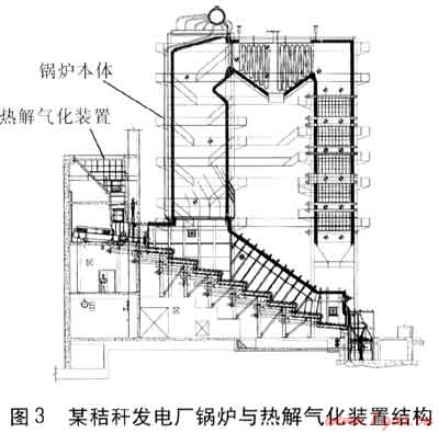 熱解氣化技術(shù)是將農(nóng)林生物質(zhì)在缺氧或微氧狀態(tài)下通過高溫化學(xué)反應(yīng),將其分解成可燃氣體,作為鍋爐設(shè)備的燃料,實現(xiàn)能量的轉(zhuǎn)換。目前熱解氣化技術(shù)主要用于發(fā)電。某秸稈發(fā)電廠鍋爐與熱解氣化裝置結(jié)構(gòu)見圖3[19~20]。這種熱解氣化裝置在結(jié)構(gòu)上類似往復(fù)爐排,秸稈在熱解氣化裝置內(nèi)轉(zhuǎn)化為可燃氣體,燃氣從鍋爐底部進入燃燒室進行燃燒。作為熱化學(xué)轉(zhuǎn)化的一種工藝方法,熱解氣化技術(shù)利用熱解氣化裝置將農(nóng)林生物質(zhì)經(jīng)過轉(zhuǎn)化產(chǎn)生的燃氣直接供給鍋爐設(shè)備燃燒。以熱化學(xué)為基礎(chǔ)的熱解氣化技術(shù),強化了生物質(zhì)的能量密度和能量強度,提高了其利用品位。