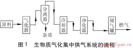 目前,生物質(zhì)資源的處理方式主要有生物質(zhì)氣化技術(shù)[12~14]、固化成型技術(shù)[15~18]。國內(nèi)提出的生物質(zhì)氣化集中供氣系統(tǒng)的流程見圖1。該技術(shù)采用氣化的方法將農(nóng)林生物質(zhì)轉(zhuǎn)換為可燃氣體,氣化效率達到了72%~75%,燃氣低熱值達到5MJ/m3。生物質(zhì)固化成型技術(shù)是將農(nóng)林生物質(zhì)粉碎后,通過成型設(shè)備加工成顆粒、塊、棒、片等形狀直接燃燒。固化成型技術(shù)的工藝、設(shè)備簡單,燃料便于儲存和長途運輸,易于實現(xiàn)產(chǎn)業(yè)化大規(guī)模生產(chǎn)和應(yīng)用。這種技術(shù)不需特殊的燃燒設(shè)備,對現(xiàn)有鍋爐設(shè)備進行簡單改造即可,技術(shù)經(jīng)濟性能相對較高。