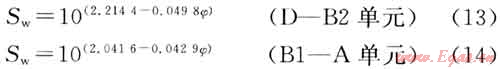 4) 利用測(cè)井計(jì)算的孔隙度,根據(jù)低侵巖心分析的含水飽和度和孔隙度二項(xiàng)式回歸公式計(jì)算,其公式為: