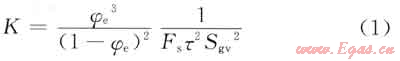 式中K為滲透率,mD;φe為有效孔隙度,小數(shù);Fsτ2為Kozeny常數(shù);Sgv為單位顆粒體積比表面,μm-1。