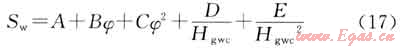 6) 利用測(cè)井所得的孔隙度和氣水界面高度,根據(jù)低侵巖心分析的含水飽和度和孔隙度采用二項(xiàng)式回歸公式計(jì)算,氣水過渡帶盡管沒有巖心含水飽和度,但是通過利用巖心毛細(xì)管壓力資料建立J函數(shù)飽和度模型后可以獲取過渡帶飽和度數(shù)據(jù),因此綜合油基鉆井液密閉心飽和度及毛細(xì)管壓力飽和度資料建模,可同時(shí)兼顧氣藏主體高部位及過渡帶,其模型如下:
