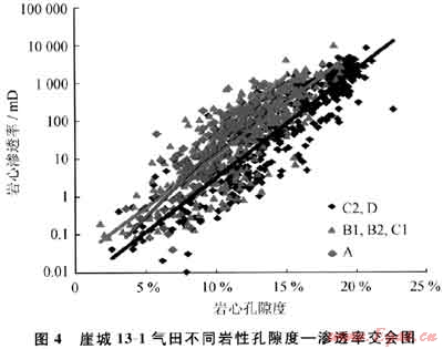 筆者探索了幾種辦法,以減少孔滲關(guān)系圖上點(diǎn)子的分散性。首先,也是最明顯的,就是看巖相對(duì)點(diǎn)子的分散性造成了多大的影響,于是,按照巖心地質(zhì)描述得到的巖相作了孔滲關(guān)系圖,發(fā)現(xiàn)每一類數(shù)據(jù)點(diǎn)的分布與其他都不相同,但又有許多重疊部分。因此,即使我們可以從測(cè)井曲線中得到巖相的信息,這種方法依然不能精確地用孔隙度來確定滲透率值。