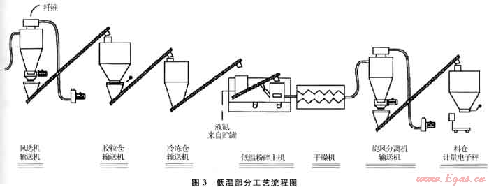 從常溫料倉出來的20~30目的常溫膠粉通過螺旋輸送機輸送到冷凍室進行冷凍。冷凍室由入口氣塞、出口氣塞和液氮控制系統(tǒng)組成。液氮將膠粉從常溫冷凍到玻璃化溫度,而冷凍室內(nèi)的螺旋推進器可以推動膠粉通過冷凍室。冷凍室由不銹鋼內(nèi)筒、電鍍外殼和中間絕緣部件組成,并安裝有橡膠涂層的傳動輪,使裝置能有效旋轉(zhuǎn)并保持磨損最小。經(jīng)冷凍室冷凍過的膠粉再由螺旋輸送機輸送到細碎機進行進一步的粉碎。細碎機的電機功率一般為50~150kW,帶有變頻驅(qū)動器,可以按要求粉碎出80目以上的膠粉產(chǎn)品。經(jīng)過細碎機細碎的膠粉通過螺旋輸送裝置輸送到干燥系統(tǒng)進行干燥,干燥系統(tǒng)配有熱風爐,由風機把加熱后的空氣送入干燥機對膠粉進行加熱,以此來去除膠粉中的水分,防止膠粉在輸送過程中出現(xiàn)結(jié)塊和堵塞現(xiàn)象。在干燥機的末端有1套分離系統(tǒng)負責不同粒度膠粉的分離,通過這套分離系統(tǒng)可以把大顆粒的膠粉分離出來送回冷凍室進行進一步的粉碎,分離后的合格固體膠粉進入細粉料倉進行稱重、包裝和成品入庫。該流程如圖3所示。