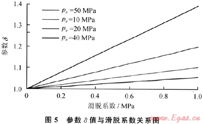 由圖5及式(10)可以看出:氣井無阻流量比值與滑脫系數(shù)(b)呈線性關(guān)系;滑脫系數(shù)(6)越大,供給邊界壓力(pe)越小,參數(shù)δ越大,氣體滑脫對(duì)氣井產(chǎn)氣能力影響越大;當(dāng)邊界壓力(pe)較低時(shí)(如pe≤5MPa),參數(shù)δ受滑脫系數(shù)(b)影響較大,氣體滑脫效應(yīng)對(duì)氣井產(chǎn)氣能力影響較大;而當(dāng)邊界壓力(pe)較大時(shí)(如pe≥10MPa),參數(shù)δ受滑脫系數(shù)(b)影響不大,氣體滑脫效應(yīng)對(duì)氣井產(chǎn)氣能力影響較小,這一計(jì)算結(jié)果與室內(nèi)巖心滲流實(shí)驗(yàn)結(jié)果一致。