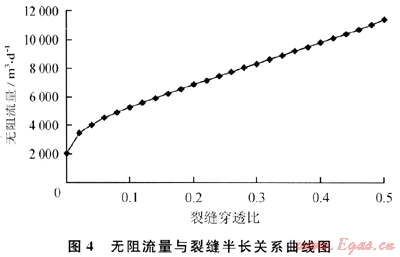 南式(9)的產(chǎn)能公式計(jì)算得到不同裂縫穿透比(Lf/re)對(duì)應(yīng)的氣井無阻流量如圖4所示,其中選用的原始儲(chǔ)層壓力為10MPa,即邊界壓力(pe)為10MPa,滑脫系數(shù)(b)為0.6MPa作為產(chǎn)能計(jì)算的參數(shù)值。