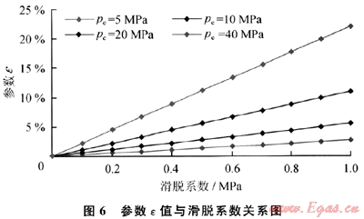 由圖6及式(11)可以看出:滑脫系數(shù)(b)越大,供給邊界壓力(pe)越小,參數(shù)ε越大,氣體滑脫對(duì)氣井生產(chǎn)影響越大;當(dāng)邊界壓力(pe)較低時(shí)(如pe≤5MPa),參數(shù)e受滑脫系數(shù)(b)影響較大,氣體滑脫效應(yīng)對(duì)氣井生產(chǎn)影響較大;而當(dāng)邊界壓力(pe)較大時(shí)(如pe≥10MPa),參數(shù)ε受滑脫系數(shù)(b)影響較小,氣體滑脫效應(yīng)對(duì)氣井生產(chǎn)影響較小,小于10%。這一計(jì)算結(jié)果與室內(nèi)巖心滲流實(shí)驗(yàn)結(jié)果也是完全一致的,說明低滲氣藏儲(chǔ)層滑脫效應(yīng)決定于孔隙壓力大小的結(jié)論是正確的。