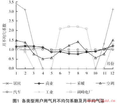 參考北京、天津、鄭州、廊坊等用氣特點(diǎn),得到我國北方地區(qū)各類用戶典型月用氣不均勻系數(shù),如圖1所示。其中,采暖、空調(diào)、調(diào)峰電廠用戶用氣的季節(jié)不均勻性較強(qiáng),居民、商業(yè)、工業(yè)、汽車用戶用氣相對(duì)平穩(wěn)??照{(diào)、分布式能源、調(diào)峰電廠用戶除能消費(fèi)一部分低谷氣量外,還可以為電力系統(tǒng)削峰,減少峰電建設(shè)投入,同時(shí)提高供電可靠性,是電網(wǎng)的有益補(bǔ)充。