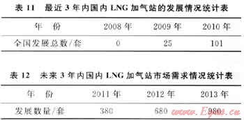 對LNG燃料汽車發(fā)展進(jìn)度影響最大的是配套LNG加氣站的建設(shè)。目前,我國3大能源企業(yè)(中石油、中石化、中海油)及新疆廣匯、新奧燃?xì)?、中國港華燃?xì)?、華潤燃?xì)獾纫慌鞠嗬^進(jìn)入了LNG替代汽柴油用于新能源汽車的研究領(lǐng)域,并相應(yīng)作出了3~5年建設(shè)LNG汽車加氣站、生產(chǎn)LNG公交汽車和重型卡車的規(guī)劃。表11、12分別是最近3年內(nèi)國內(nèi)LNG加氣站的發(fā)展情況及未來3年的市場需求情況統(tǒng)計[5]。