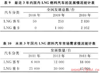 近年來,我國LNG燃料汽車已進(jìn)入了快速發(fā)展通道,在短短的3年時間內(nèi),國內(nèi)已經(jīng)有新疆、山西、內(nèi)蒙古等地的LNG重型卡車及北京、杭州、深圳、烏魯木齊、昆明、???、湛江、張家口等城市LNG公交相繼投入了運行,而且這一城市群體還在迅速擴(kuò)大,充分說明了LNG燃料汽車的技術(shù)已經(jīng)完全成熟、節(jié)能減排優(yōu)勢明顯。表9、10分別反映了最近3年內(nèi)國內(nèi)LNG燃料汽車的發(fā)展情況及未來3年汽車市場需求情況[5]。