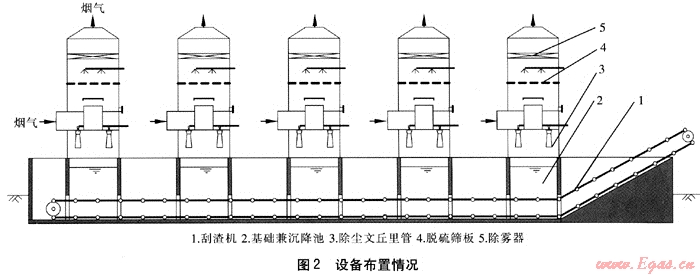 脫硫除塵裝置安裝在原除塵器的位置,底部基礎(chǔ)兼做沉降池,在池底安裝刮渣機,5臺雙循環(huán)煙氣脫硫除塵裝置基礎(chǔ)連通,共用一臺刮渣機,沉降的灰渣經(jīng)刮渣機的框鏈集中運輸?shù)交覉觥kp循環(huán)脫硫除塵裝置總阻力比原除塵器僅增加500Pa,因此可保留原引風(fēng)機。增加一個除塵水循環(huán)池和一個堿液循環(huán)池,除塵水循環(huán)池與沉降池連通,除塵水循環(huán)泵將除塵水通過噴頭送入文丘里管與煙氣混合,在喉口處煙塵與液滴充分混合,煙塵被加濕?;咚倭鞒鑫那鹄锕芎鬀_擊液面,被液面捕集,灰渣沉降于池底被刮渣機清除,清液流回除塵水循環(huán)池循環(huán)使用。堿液循環(huán)泵將堿液送入脫硫塔,在篩板上與除塵后的煙氣混合形成流化床,煙氣中的二氧化硫被吸收,脫硫后的煙氣經(jīng)除霧器脫水后排出,脫硫后的堿液經(jīng)排液口流回堿液循環(huán)池調(diào)整pH值后循環(huán)使用。設(shè)備外部堿液循環(huán)管道和除塵水循環(huán)管道均采用UPVC工程塑料管。